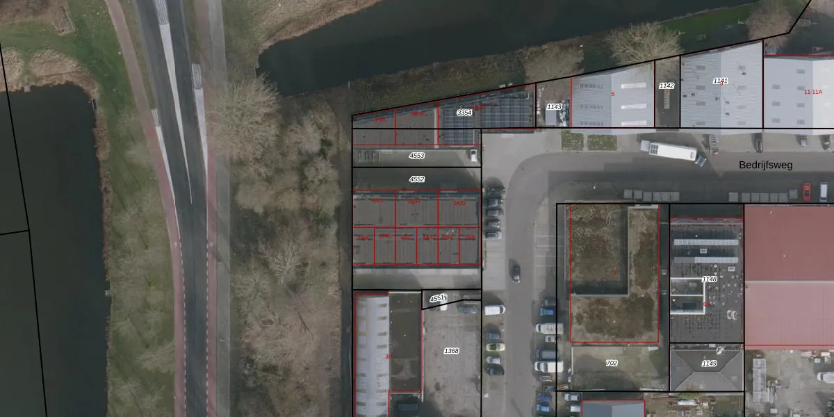 Het perceel waarop Bedrijfsweg 3-A-H staat heeft een oppervlakte van 912 m². Dit is een groot perceel. De perceeloppervlakte wordt geregistreerd door het Kadaster. Gedetailleerde informatie over de maten van dit perceel kunt u vinden in het rapport Kadastrale kaart met maatvoering van Bedrijfsweg 3-A-H.