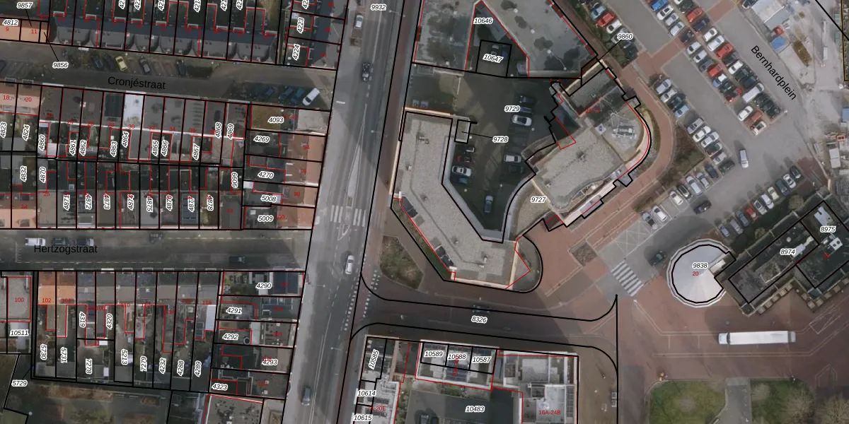 Het perceel waarop Bernhardplein 24-F staat heeft een oppervlakte van 1400 m². Dit is een zeer groot perceel. De perceeloppervlakte wordt geregistreerd door het Kadaster. Gedetailleerde informatie over de maten van dit perceel kunt u vinden in het rapport Kadastrale kaart met maatvoering van Bernhardplein 24-F.
