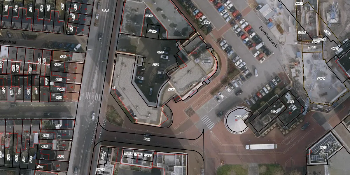 Het perceel waarop Bernhardplein 25 staat heeft een oppervlakte van 1400 m². Dit is een zeer groot perceel. De perceeloppervlakte wordt geregistreerd door het Kadaster. Gedetailleerde informatie over de maten van dit perceel kunt u vinden in het rapport Kadastrale kaart met maatvoering van Bernhardplein 25.