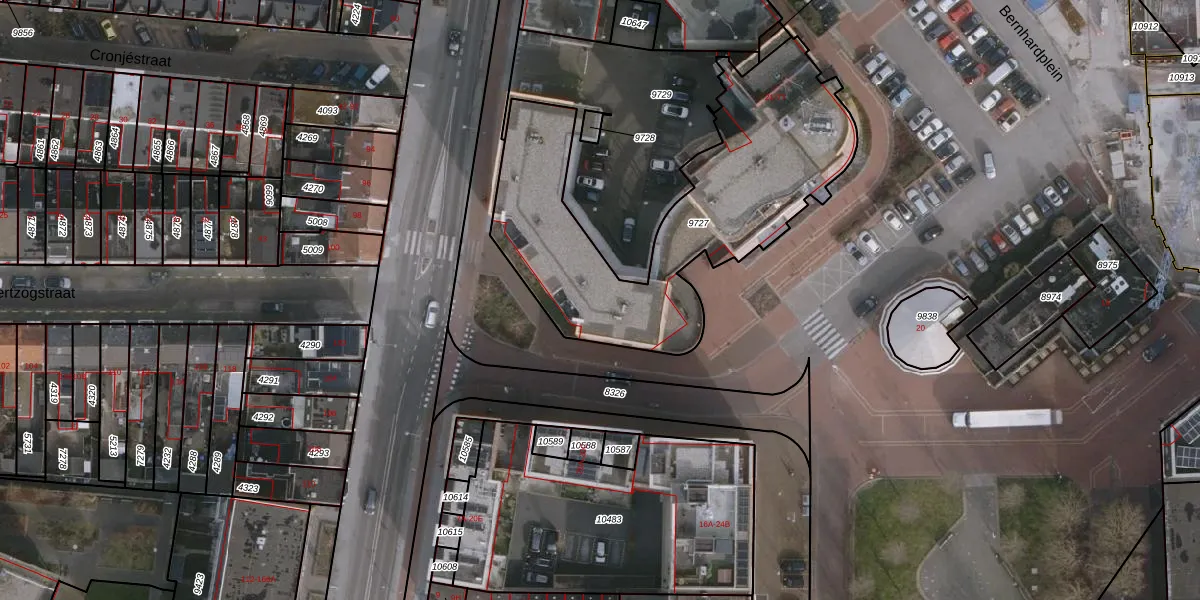 Het perceel waarop Bernhardplein 26 staat heeft een oppervlakte van 1400 m². Dit is een zeer groot perceel. De perceeloppervlakte wordt geregistreerd door het Kadaster. Gedetailleerde informatie over de maten van dit perceel kunt u vinden in het rapport Kadastrale kaart met maatvoering van Bernhardplein 26.