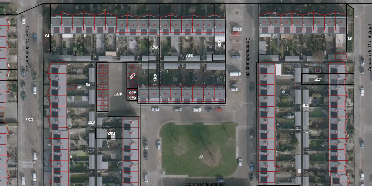 Het perceel waarop Commandeursplein 12 staat heeft een oppervlakte van 1700 m². Dit is een zeer groot perceel. De perceeloppervlakte wordt geregistreerd door het Kadaster. Gedetailleerde informatie over de maten van dit perceel kunt u vinden in het rapport Kadastrale kaart met maatvoering van Commandeursplein 12.