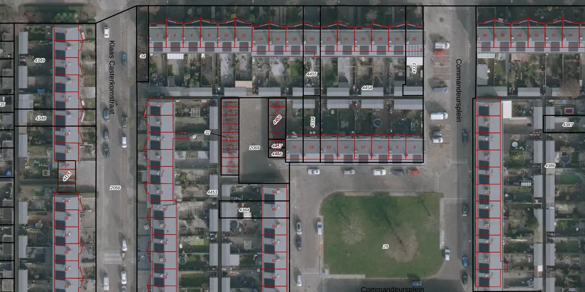 Het perceel waarop Commandeursplein 20 staat heeft een oppervlakte van 5934 m². Dit is een zeer groot perceel. De perceeloppervlakte wordt geregistreerd door het Kadaster. Gedetailleerde informatie over de maten van dit perceel kunt u vinden in het rapport Kadastrale kaart met maatvoering van Commandeursplein 20.