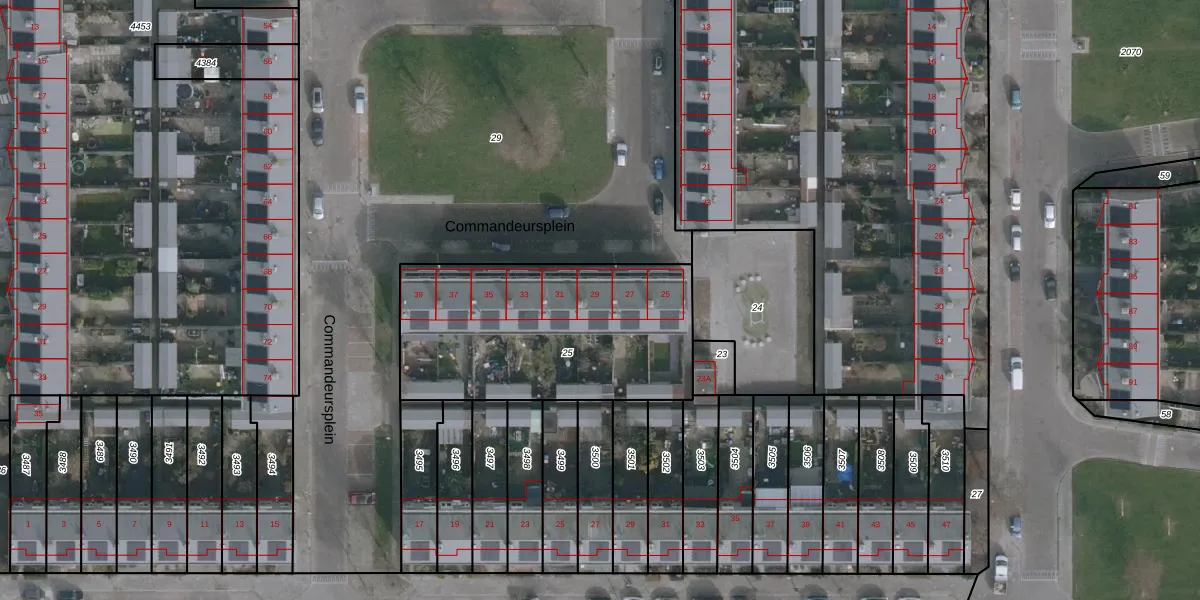 Het perceel waarop Commandeursplein 29 staat heeft een oppervlakte van 1109 m². Dit is een zeer groot perceel. De perceeloppervlakte wordt geregistreerd door het Kadaster. Gedetailleerde informatie over de maten van dit perceel kunt u vinden in het rapport Kadastrale kaart met maatvoering van Commandeursplein 29.