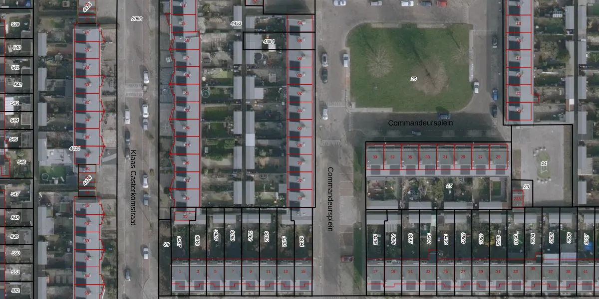 Het perceel waarop Commandeursplein 68 staat heeft een oppervlakte van 5934 m². Dit is een zeer groot perceel. De perceeloppervlakte wordt geregistreerd door het Kadaster. Gedetailleerde informatie over de maten van dit perceel kunt u vinden in het rapport Kadastrale kaart met maatvoering van Commandeursplein 68.