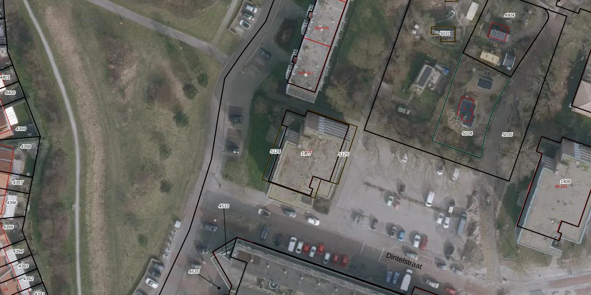 Het perceel waarop Dintelstraat 15 staat heeft een oppervlakte van 523 m². Dit is een groot perceel. De perceeloppervlakte wordt geregistreerd door het Kadaster. Gedetailleerde informatie over de maten van dit perceel kunt u vinden in het rapport Kadastrale kaart met maatvoering van Dintelstraat 15.