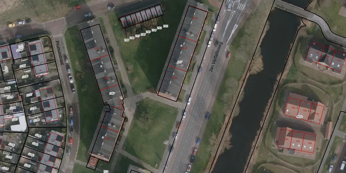 Het perceel waarop Jan Verfailleweg 64 staat heeft een oppervlakte van 637 m². Dit is een groot perceel. De perceeloppervlakte wordt geregistreerd door het Kadaster. Gedetailleerde informatie over de maten van dit perceel kunt u vinden in het rapport Kadastrale kaart met maatvoering van Jan Verfailleweg 64.