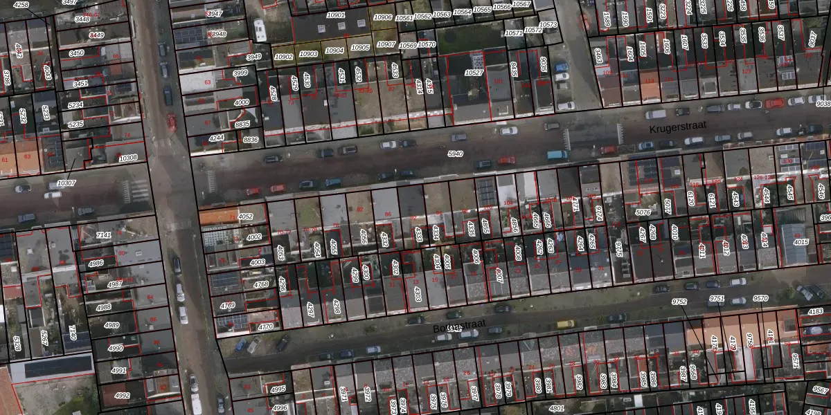 Het perceel waarop Krugerstraat 92 staat heeft een oppervlakte van 96 m². Dit is een klein perceel. De perceeloppervlakte wordt geregistreerd door het Kadaster. Gedetailleerde informatie over de maten van dit perceel kunt u vinden in het rapport Kadastrale kaart met maatvoering van Krugerstraat 92.