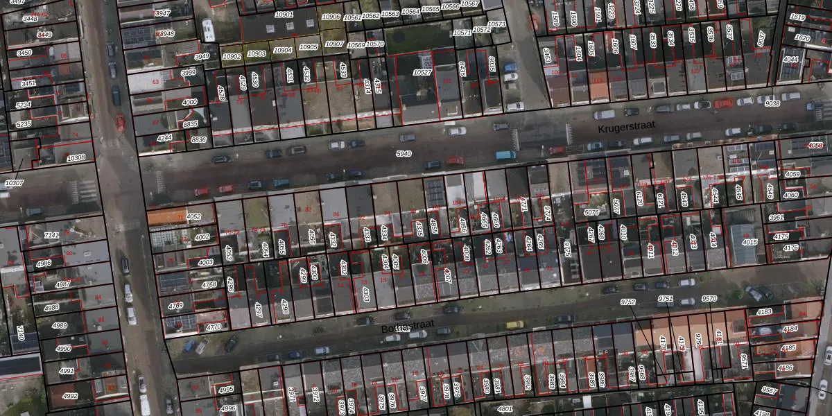 Het perceel waarop Krugerstraat 98 staat heeft een oppervlakte van 94 m². Dit is een klein perceel. De perceeloppervlakte wordt geregistreerd door het Kadaster. Gedetailleerde informatie over de maten van dit perceel kunt u vinden in het rapport Kadastrale kaart met maatvoering van Krugerstraat 98.