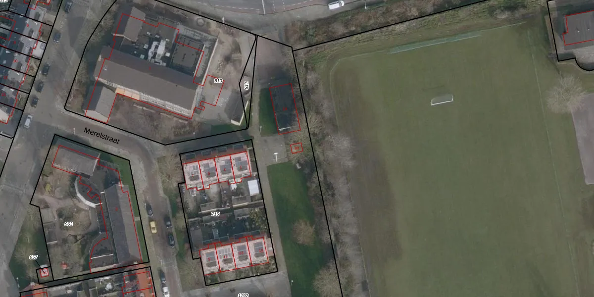Het perceel waarop Merelstraat 1-B staat heeft een oppervlakte van 8188 m². Dit is een zeer groot perceel. De perceeloppervlakte wordt geregistreerd door het Kadaster. Gedetailleerde informatie over de maten van dit perceel kunt u vinden in het rapport Kadastrale kaart met maatvoering van Merelstraat 1-B.