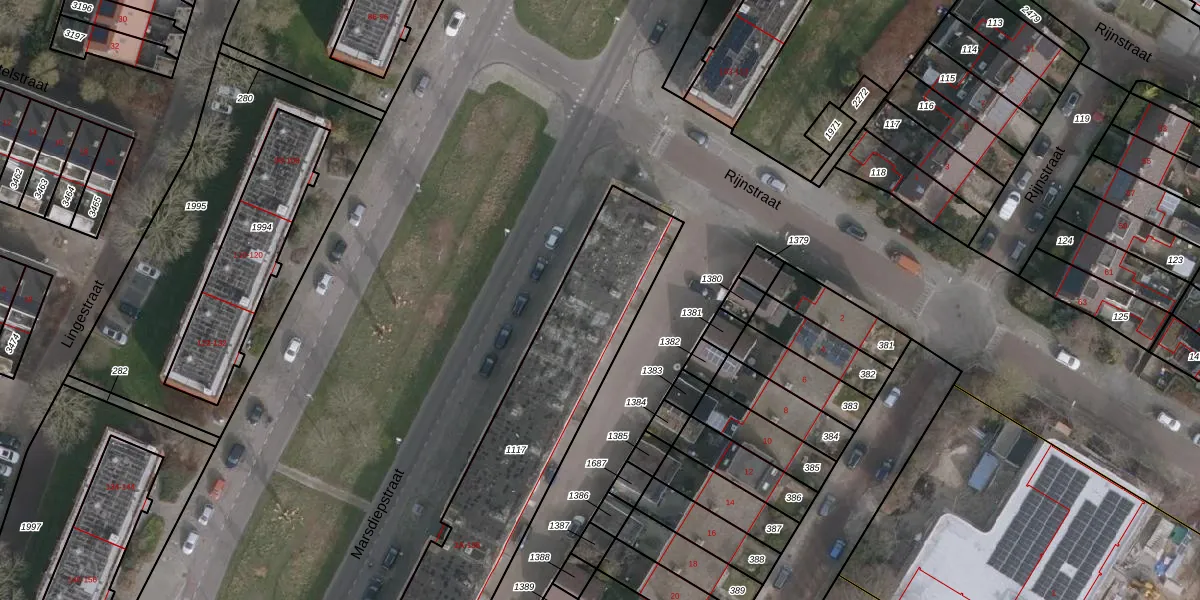 Het perceel waarop Rijnstraat 2-M staat heeft een oppervlakte van 1728 m². Dit is een zeer groot perceel. De perceeloppervlakte wordt geregistreerd door het Kadaster. Gedetailleerde informatie over de maten van dit perceel kunt u vinden in het rapport Kadastrale kaart met maatvoering van Rijnstraat 2-M.