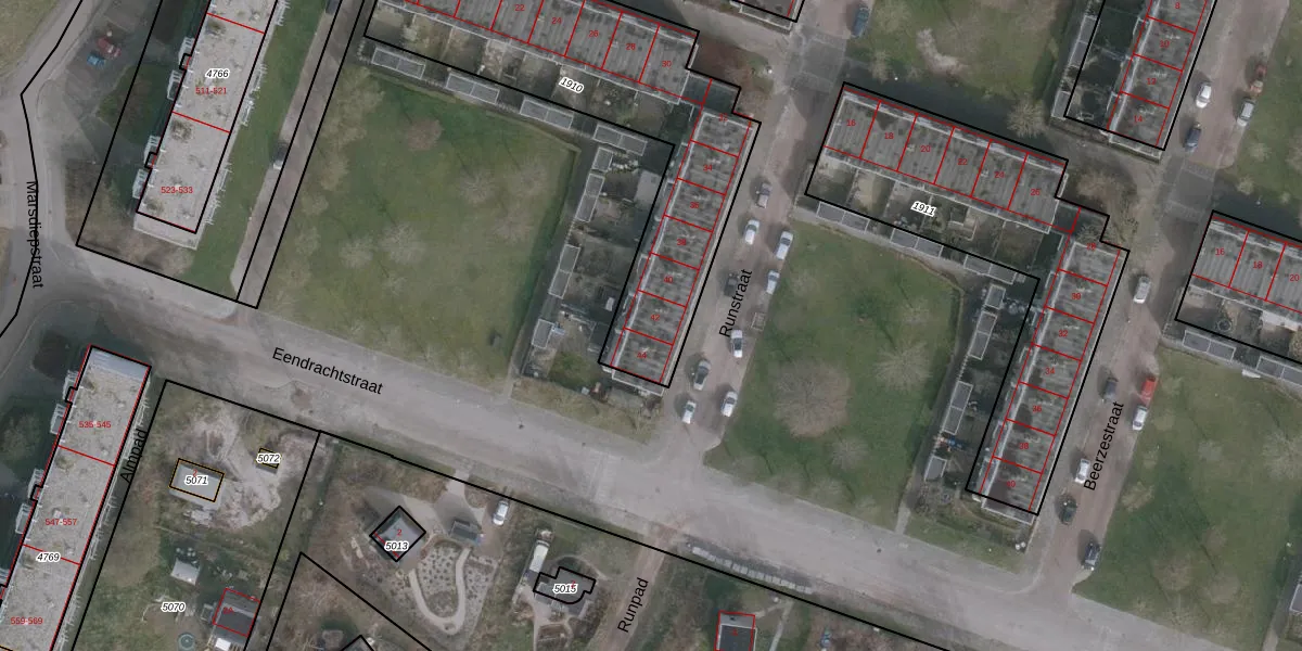 Het perceel waarop Runstraat 42 staat heeft een oppervlakte van 1406 m². Dit is een zeer groot perceel. De perceeloppervlakte wordt geregistreerd door het Kadaster. Gedetailleerde informatie over de maten van dit perceel kunt u vinden in het rapport Kadastrale kaart met maatvoering van Runstraat 42.