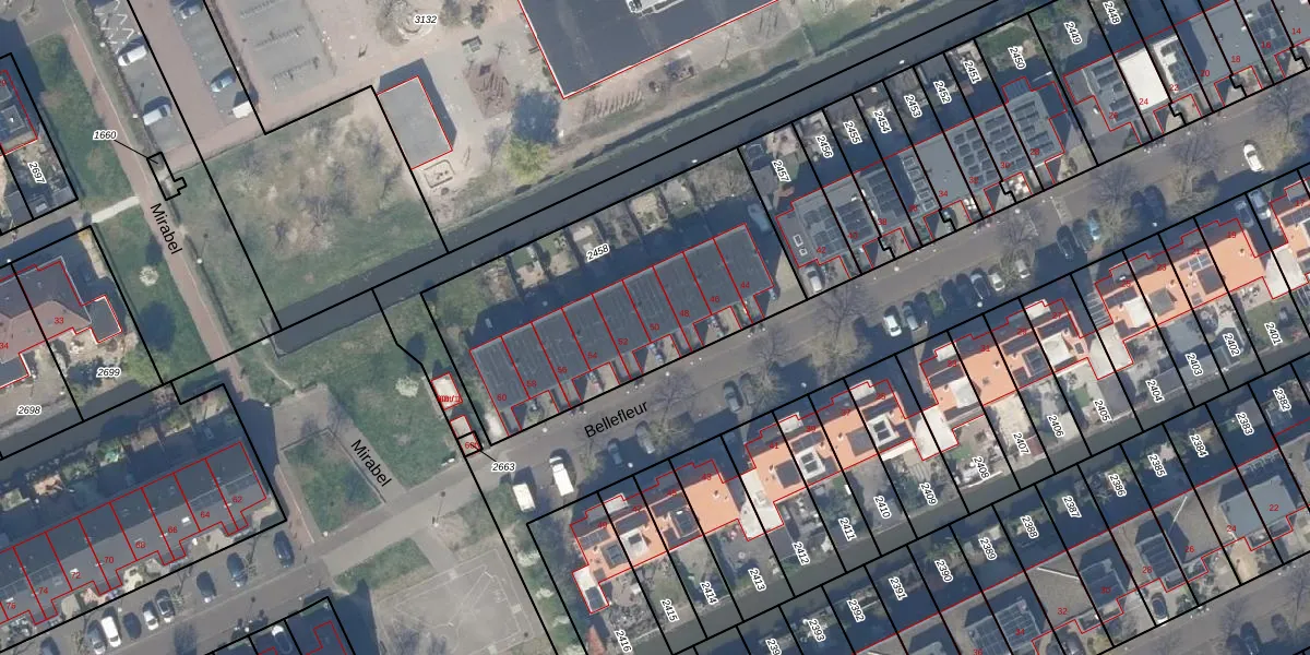 Het perceel waarop Bellefleur 50 staat heeft een oppervlakte van 1363 m². Dit is een zeer groot perceel. De perceeloppervlakte wordt geregistreerd door het Kadaster. Gedetailleerde informatie over de maten van dit perceel kunt u vinden in het rapport Kadastrale kaart met maatvoering van Bellefleur 50.