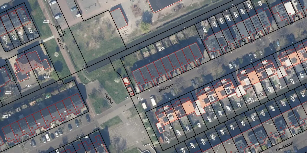 Het perceel waarop Bellefleur 56 staat heeft een oppervlakte van 1363 m². Dit is een zeer groot perceel. De perceeloppervlakte wordt geregistreerd door het Kadaster. Gedetailleerde informatie over de maten van dit perceel kunt u vinden in het rapport Kadastrale kaart met maatvoering van Bellefleur 56.