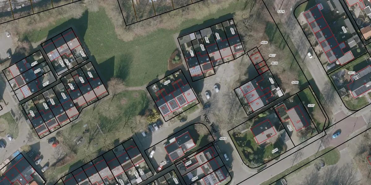Het perceel waarop Hoge Poel 23 staat heeft een oppervlakte van 440 m². Dit is een groot perceel. De perceeloppervlakte wordt geregistreerd door het Kadaster. Gedetailleerde informatie over de maten van dit perceel kunt u vinden in het rapport Kadastrale kaart met maatvoering van Hoge Poel 23.