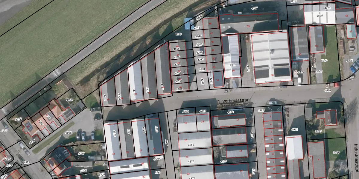 Het perceel waarop Nijverheidsstraat 40 staat heeft een oppervlakte van 65 m². Dit is een klein perceel. De perceeloppervlakte wordt geregistreerd door het Kadaster. Gedetailleerde informatie over de maten van dit perceel kunt u vinden in het rapport Kadastrale kaart met maatvoering van Nijverheidsstraat 40.