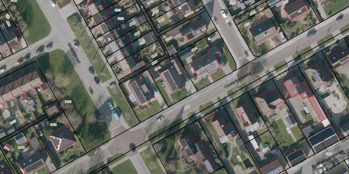 Het perceel waarop Oosterkruisweg 43 staat heeft een oppervlakte van 469 m². Dit is een groot perceel. De perceeloppervlakte wordt geregistreerd door het Kadaster. Gedetailleerde informatie over de maten van dit perceel kunt u vinden in het rapport Kadastrale kaart met maatvoering van Oosterkruisweg 43.