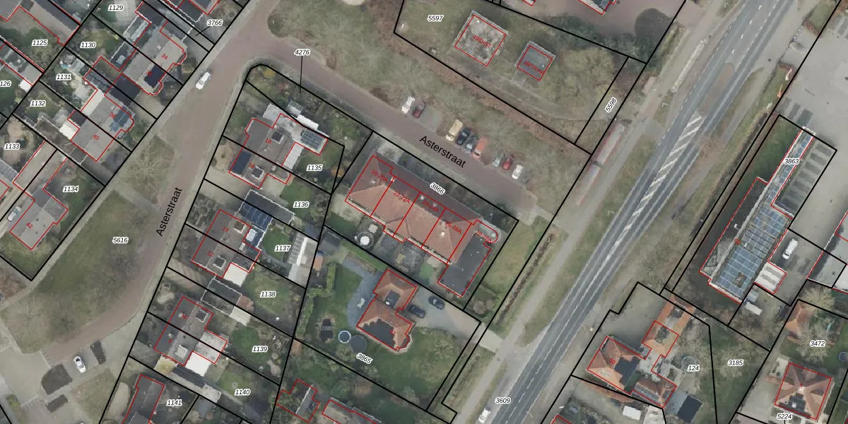 Het perceel waarop Asterstraat 24 staat heeft een oppervlakte van 1000 m². Dit is een zeer groot perceel. De perceeloppervlakte wordt geregistreerd door het Kadaster. Gedetailleerde informatie over de maten van dit perceel kunt u vinden in het rapport Kadastrale kaart met maatvoering van Asterstraat 24.