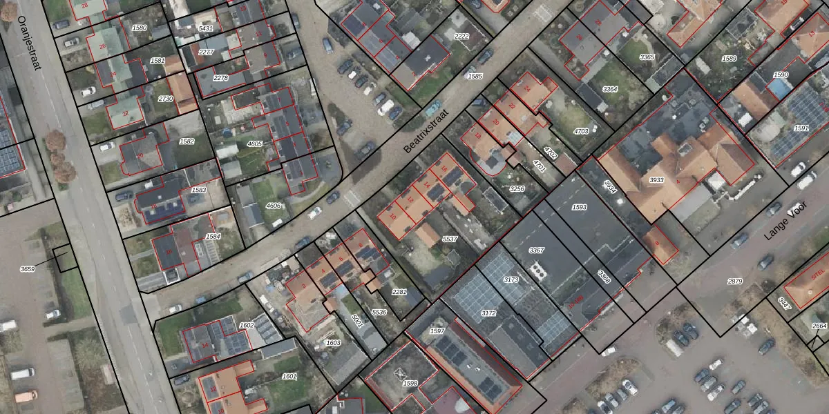 Het perceel waarop Beatrixstraat 12 staat heeft een oppervlakte van 830 m². Dit is een groot perceel. De perceeloppervlakte wordt geregistreerd door het Kadaster. Gedetailleerde informatie over de maten van dit perceel kunt u vinden in het rapport Kadastrale kaart met maatvoering van Beatrixstraat 12.