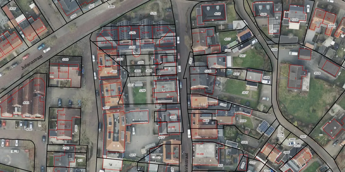 Het perceel waarop Brinkstraat 25 staat heeft een oppervlakte van 535 m². Dit is een groot perceel. De perceeloppervlakte wordt geregistreerd door het Kadaster. Gedetailleerde informatie over de maten van dit perceel kunt u vinden in het rapport Kadastrale kaart met maatvoering van Brinkstraat 25.
