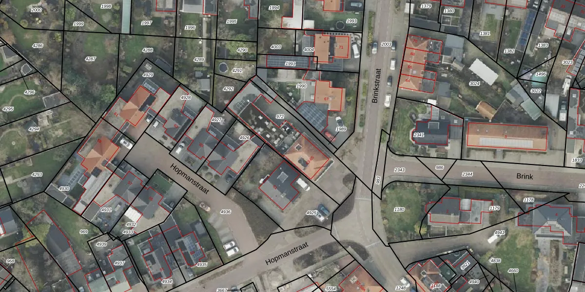 Brinkstraat 65 is gelegen op kadastraal perceel DNK00O972. Deze kadastrale aanduiding is uniek en wordt gebruikt door het Kadaster om eigendomsrechten en andere zakelijke rechten vast te leggen. Het perceel maakt onderdeel uit van de kadastrale gemeente Denekamp.