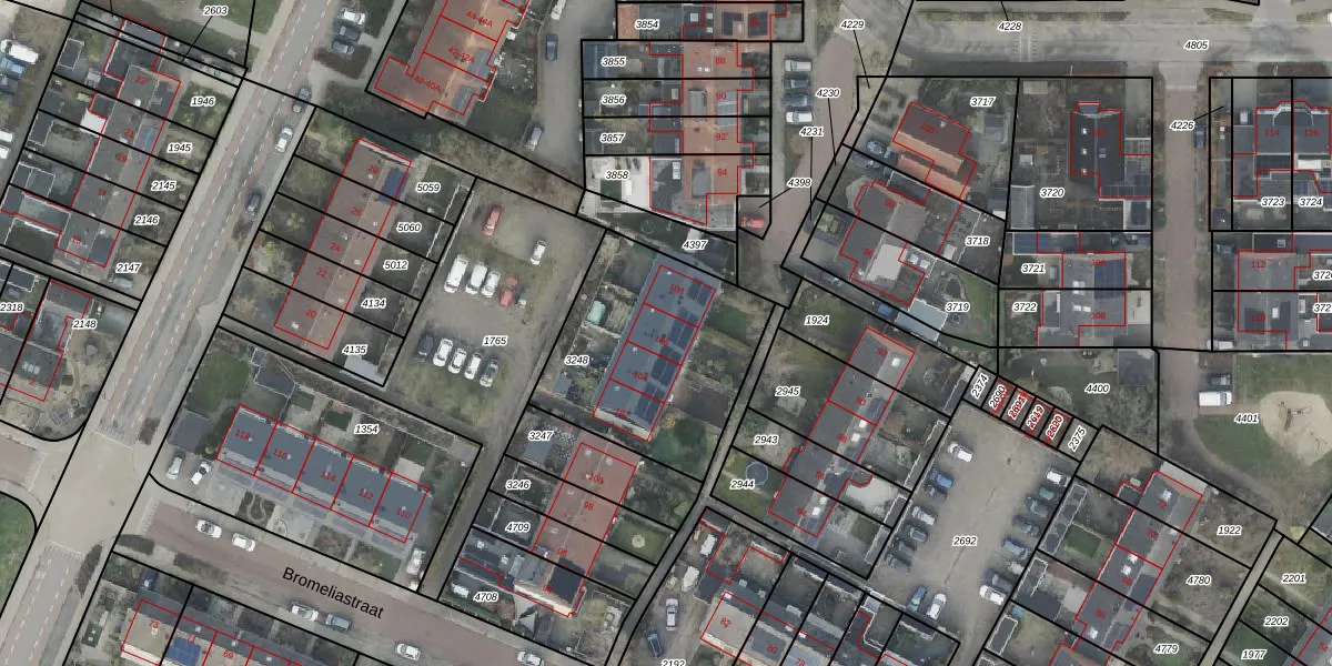 Bromeliastraat 106 is gelegen op kadastraal perceel DNK00O3248. Deze kadastrale aanduiding is uniek en wordt gebruikt door het Kadaster om eigendomsrechten en andere zakelijke rechten vast te leggen. Het perceel maakt onderdeel uit van de kadastrale gemeente Denekamp.