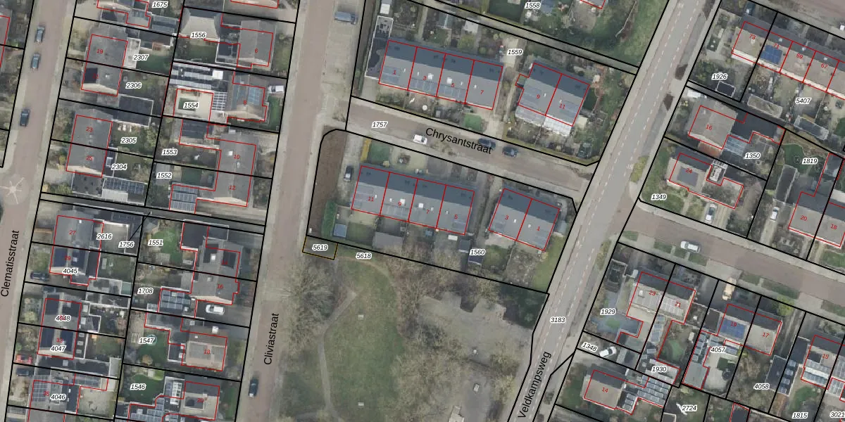 Het perceel waarop Chrysantstraat 7 staat heeft een oppervlakte van 1513 m². Dit is een zeer groot perceel. De perceeloppervlakte wordt geregistreerd door het Kadaster. Gedetailleerde informatie over de maten van dit perceel kunt u vinden in het rapport Kadastrale kaart met maatvoering van Chrysantstraat 7.