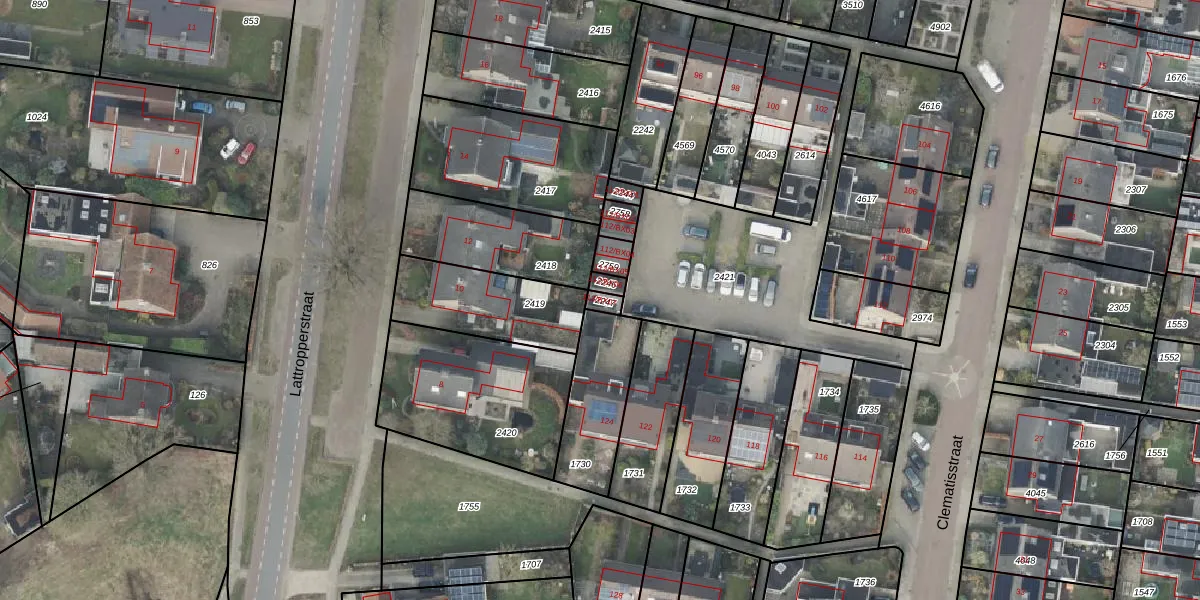 Het perceel waarop Clematisstraat 112-BX07 staat heeft een oppervlakte van 20 m². Dit is een klein perceel. De perceeloppervlakte wordt geregistreerd door het Kadaster. Gedetailleerde informatie over de maten van dit perceel kunt u vinden in het rapport Kadastrale kaart met maatvoering van Clematisstraat 112-BX07.