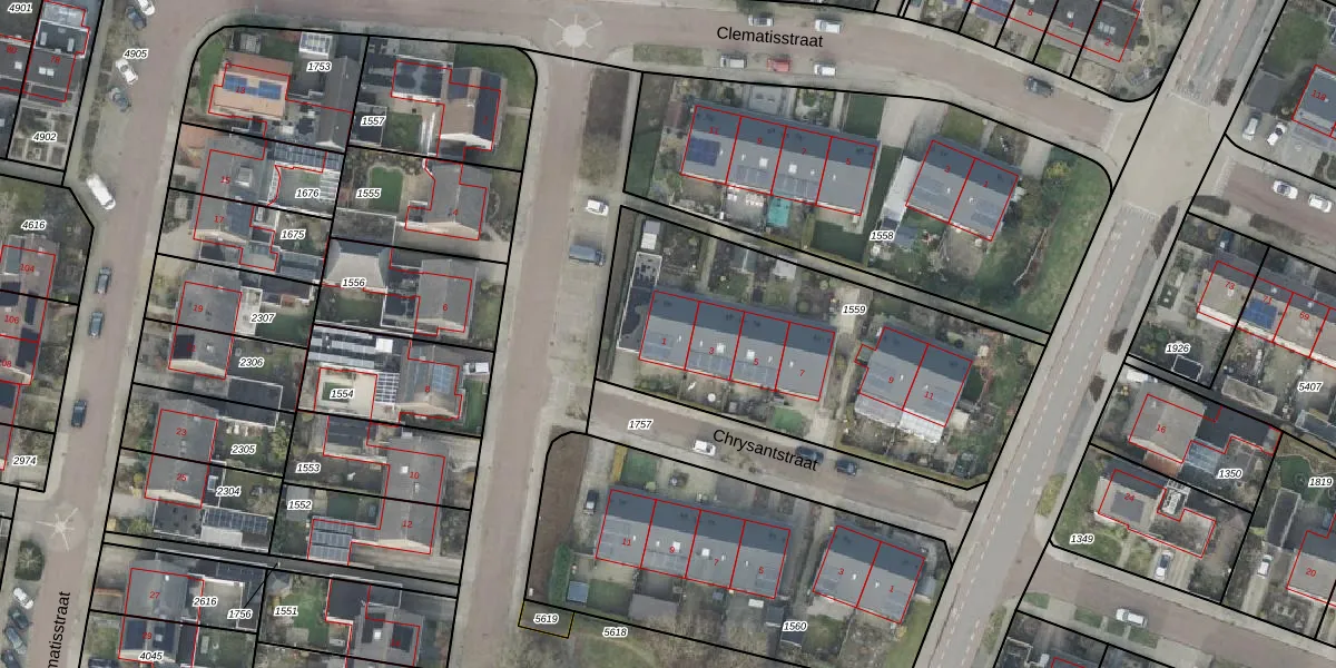 Het perceel waarop Cliviastraat 1 staat heeft een oppervlakte van 1590 m². Dit is een zeer groot perceel. De perceeloppervlakte wordt geregistreerd door het Kadaster. Gedetailleerde informatie over de maten van dit perceel kunt u vinden in het rapport Kadastrale kaart met maatvoering van Cliviastraat 1.