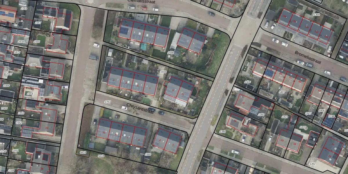 Het perceel waarop Cliviastraat 9 staat heeft een oppervlakte van 1590 m². Dit is een zeer groot perceel. De perceeloppervlakte wordt geregistreerd door het Kadaster. Gedetailleerde informatie over de maten van dit perceel kunt u vinden in het rapport Kadastrale kaart met maatvoering van Cliviastraat 9.