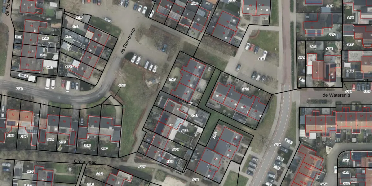 Het perceel waarop de Roerdomp 44 staat heeft een oppervlakte van 499 m². Dit is een groot perceel. De perceeloppervlakte wordt geregistreerd door het Kadaster. Gedetailleerde informatie over de maten van dit perceel kunt u vinden in het rapport Kadastrale kaart met maatvoering van de Roerdomp 44.