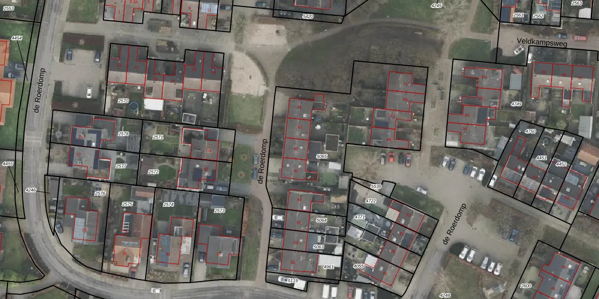 de Roerdomp 45 is gelegen op kadastraal perceel DNK00O5065. Deze kadastrale aanduiding is uniek en wordt gebruikt door het Kadaster om eigendomsrechten en andere zakelijke rechten vast te leggen. Het perceel maakt onderdeel uit van de kadastrale gemeente Denekamp.
