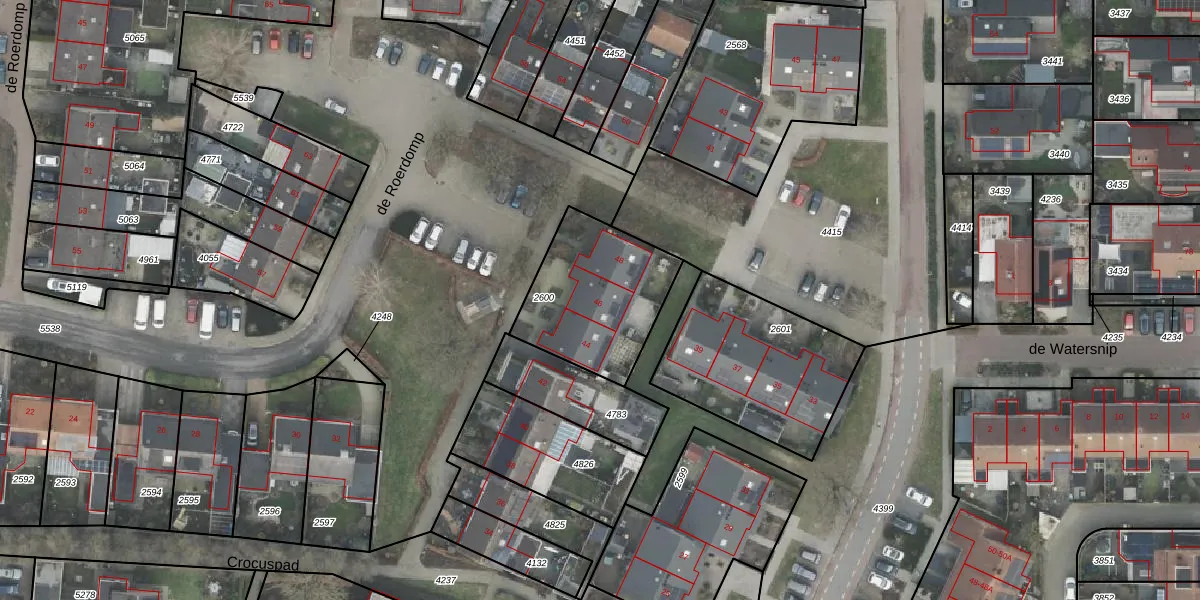 Het perceel waarop de Roerdomp 46 staat heeft een oppervlakte van 499 m². Dit is een groot perceel. De perceeloppervlakte wordt geregistreerd door het Kadaster. Gedetailleerde informatie over de maten van dit perceel kunt u vinden in het rapport Kadastrale kaart met maatvoering van de Roerdomp 46.