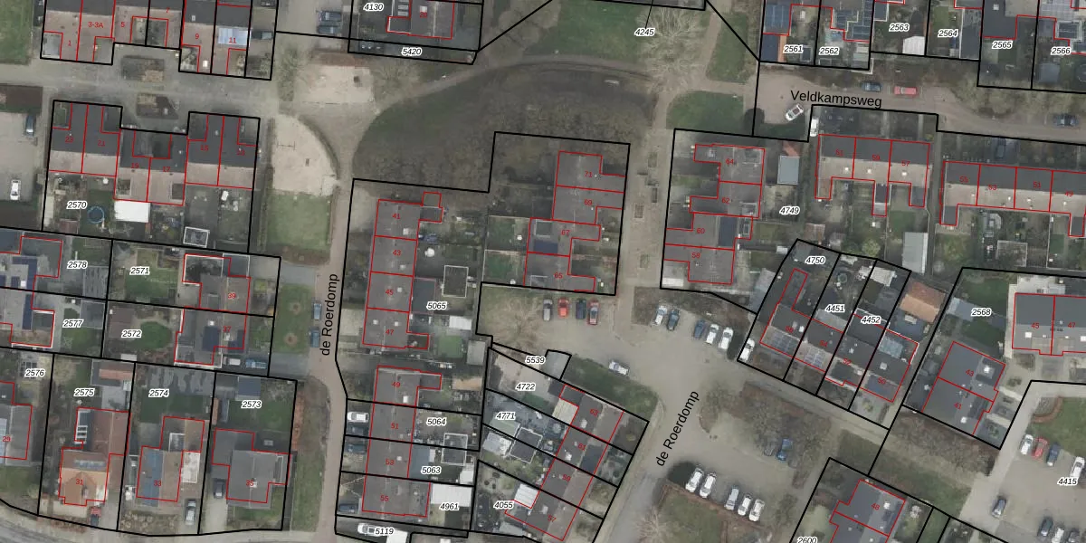de Roerdomp 65 is gelegen op kadastraal perceel DNK00O5065. Deze kadastrale aanduiding is uniek en wordt gebruikt door het Kadaster om eigendomsrechten en andere zakelijke rechten vast te leggen. Het perceel maakt onderdeel uit van de kadastrale gemeente Denekamp.