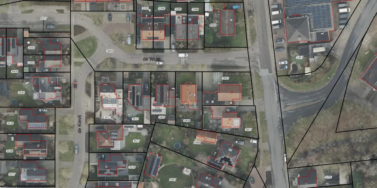 Het perceel waarop de Wulp 1 staat heeft een oppervlakte van 424 m². Dit is een groot perceel. De perceeloppervlakte wordt geregistreerd door het Kadaster. Gedetailleerde informatie over de maten van dit perceel kunt u vinden in het rapport Kadastrale kaart met maatvoering van de Wulp 1.