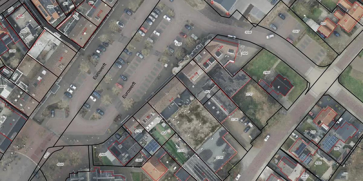 Het perceel waarop Eurowerft 12 staat heeft een oppervlakte van 1237 m². Dit is een zeer groot perceel. De perceeloppervlakte wordt geregistreerd door het Kadaster. Gedetailleerde informatie over de maten van dit perceel kunt u vinden in het rapport Kadastrale kaart met maatvoering van Eurowerft 12.