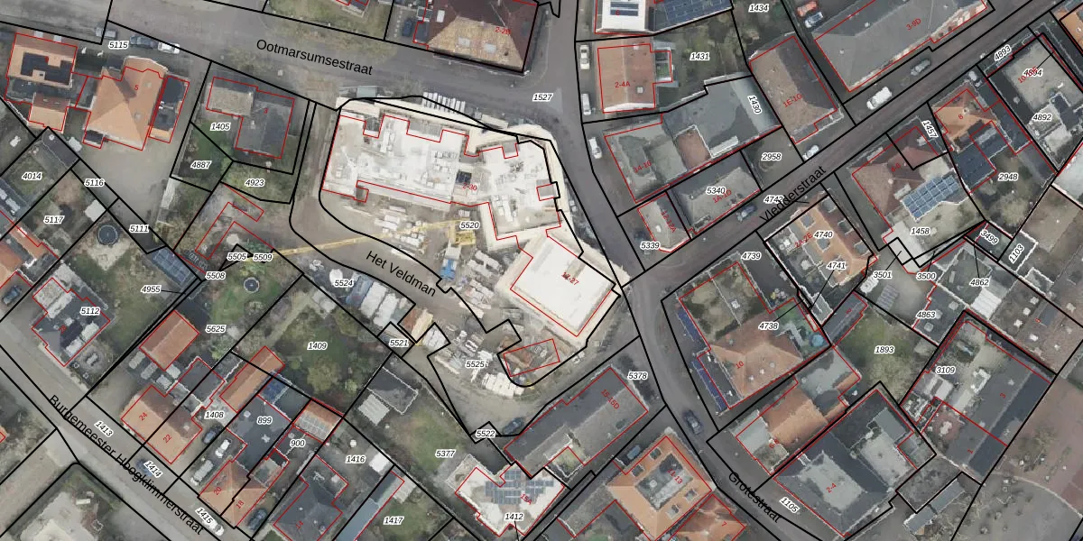 Het perceel waarop Grotestraat 23 staat heeft een oppervlakte van 1513 m². Dit is een zeer groot perceel. De perceeloppervlakte wordt geregistreerd door het Kadaster. Gedetailleerde informatie over de maten van dit perceel kunt u vinden in het rapport Kadastrale kaart met maatvoering van Grotestraat 23.