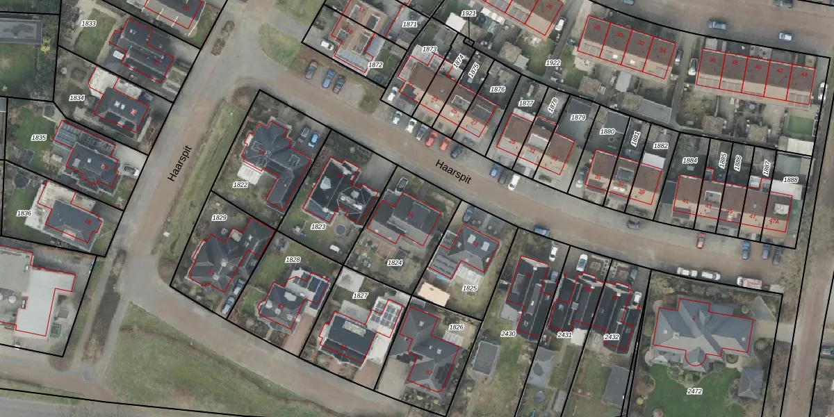 Het perceel waarop Haarspit 55 staat heeft een oppervlakte van 472 m². Dit is een groot perceel. De perceeloppervlakte wordt geregistreerd door het Kadaster. Gedetailleerde informatie over de maten van dit perceel kunt u vinden in het rapport Kadastrale kaart met maatvoering van Haarspit 55.