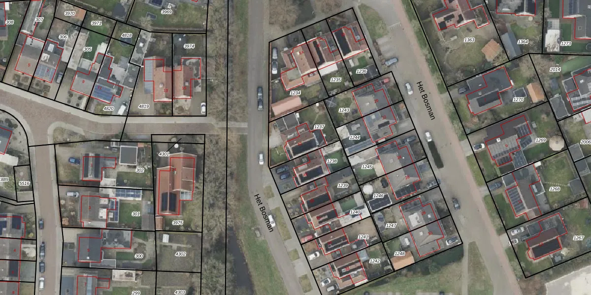 Het perceel waarop Het Bosman 42 staat heeft een oppervlakte van 340 m². Dit is een groot perceel. De perceeloppervlakte wordt geregistreerd door het Kadaster. Gedetailleerde informatie over de maten van dit perceel kunt u vinden in het rapport Kadastrale kaart met maatvoering van Het Bosman 42.