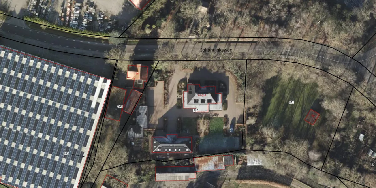 Het perceel waarop Johanninksweg 61-A staat heeft een oppervlakte van 3100 m². Dit is een zeer groot perceel. De perceeloppervlakte wordt geregistreerd door het Kadaster. Gedetailleerde informatie over de maten van dit perceel kunt u vinden in het rapport Kadastrale kaart met maatvoering van Johanninksweg 61-A.