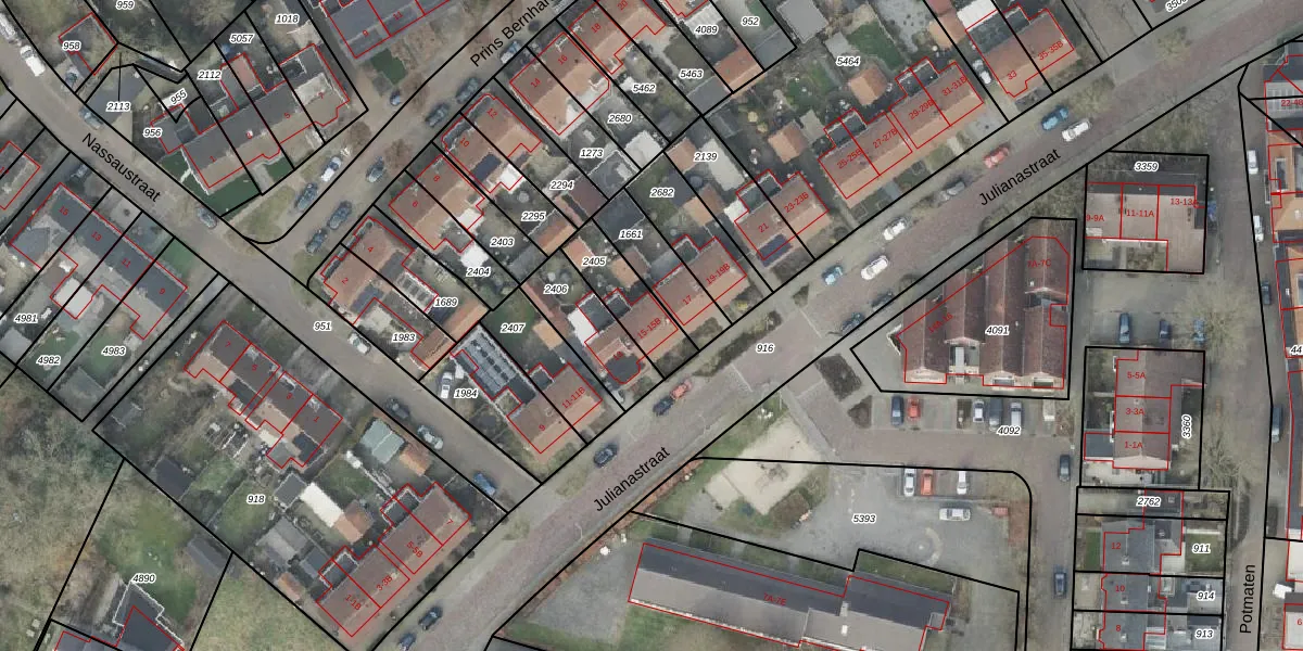 Het perceel waarop Julianastraat 15 staat heeft een oppervlakte van 181 m². Dit is een middelgroot perceel. De perceeloppervlakte wordt geregistreerd door het Kadaster. Gedetailleerde informatie over de maten van dit perceel kunt u vinden in het rapport Kadastrale kaart met maatvoering van Julianastraat 15.
