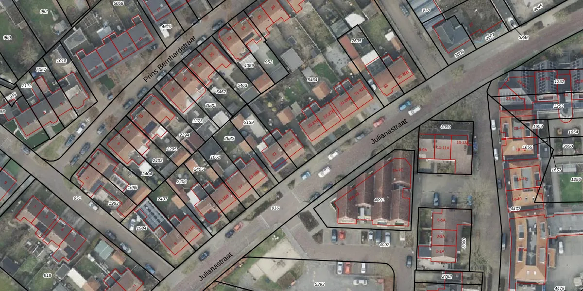 Het perceel waarop Julianastraat 23 staat heeft een oppervlakte van 2394 m². Dit is een zeer groot perceel. De perceeloppervlakte wordt geregistreerd door het Kadaster. Gedetailleerde informatie over de maten van dit perceel kunt u vinden in het rapport Kadastrale kaart met maatvoering van Julianastraat 23.