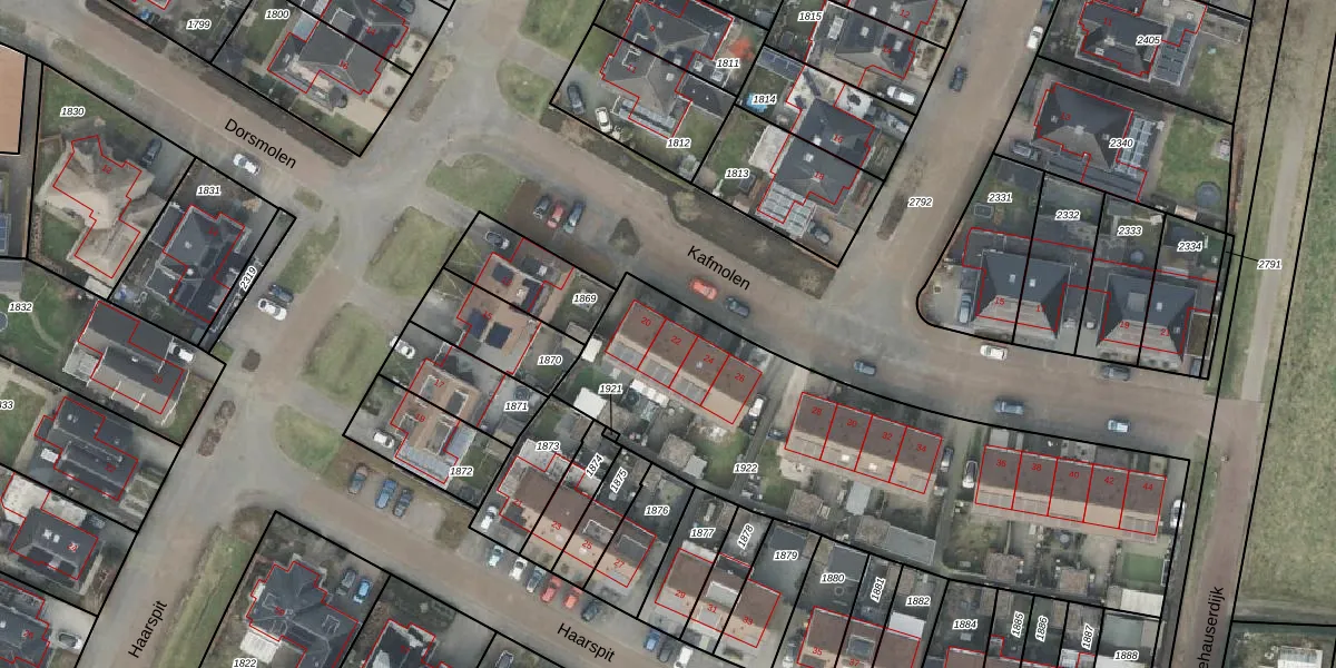 Het perceel waarop Kafmolen 22 staat heeft een oppervlakte van 2161 m². Dit is een zeer groot perceel. De perceeloppervlakte wordt geregistreerd door het Kadaster. Gedetailleerde informatie over de maten van dit perceel kunt u vinden in het rapport Kadastrale kaart met maatvoering van Kafmolen 22.