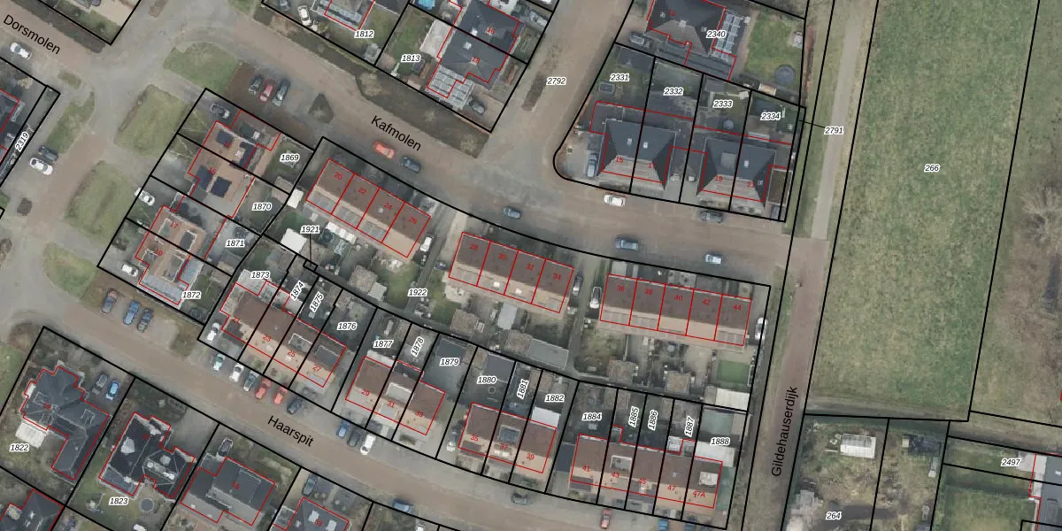 Het perceel waarop Kafmolen 32 staat heeft een oppervlakte van 2161 m². Dit is een zeer groot perceel. De perceeloppervlakte wordt geregistreerd door het Kadaster. Gedetailleerde informatie over de maten van dit perceel kunt u vinden in het rapport Kadastrale kaart met maatvoering van Kafmolen 32.