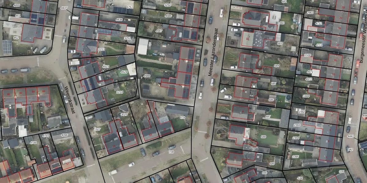 Meester Lazonderstraat 1 is gelegen op kadastraal perceel DNK00O4988. Deze kadastrale aanduiding is uniek en wordt gebruikt door het Kadaster om eigendomsrechten en andere zakelijke rechten vast te leggen. Het perceel maakt onderdeel uit van de kadastrale gemeente Denekamp.