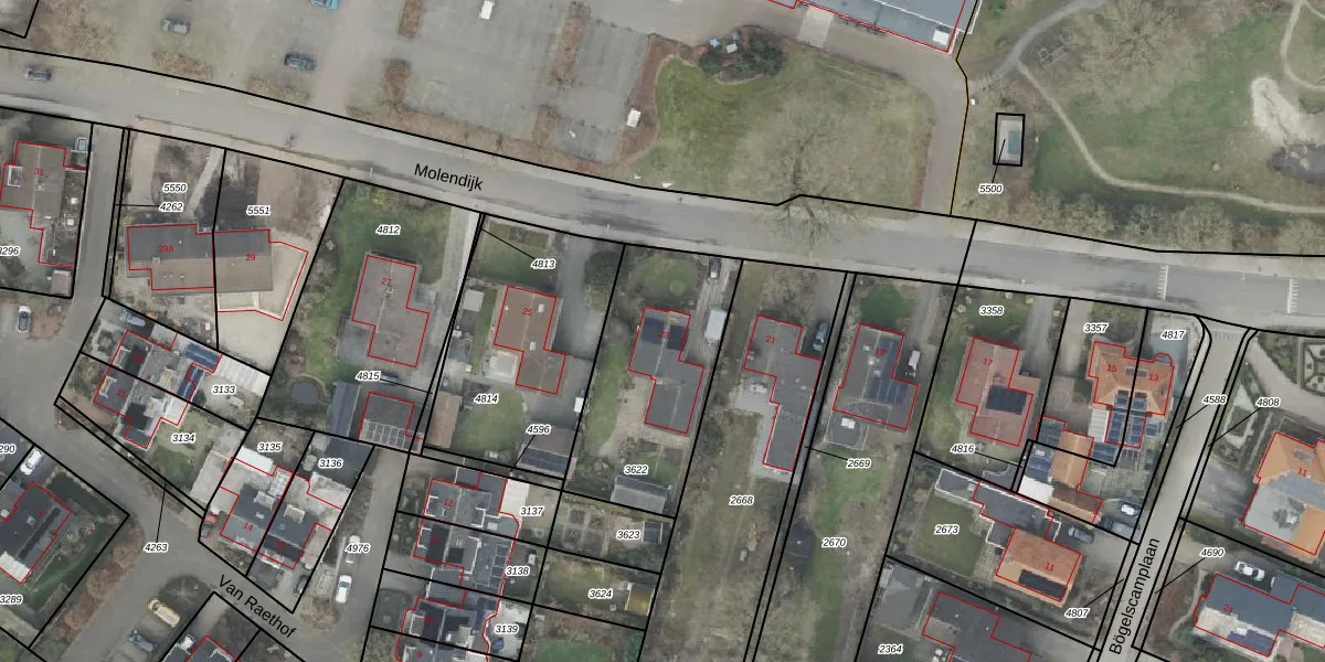 Het perceel waarop Molendijk 23 staat heeft een oppervlakte van 706 m². Dit is een groot perceel. De perceeloppervlakte wordt geregistreerd door het Kadaster. Gedetailleerde informatie over de maten van dit perceel kunt u vinden in het rapport Kadastrale kaart met maatvoering van Molendijk 23.