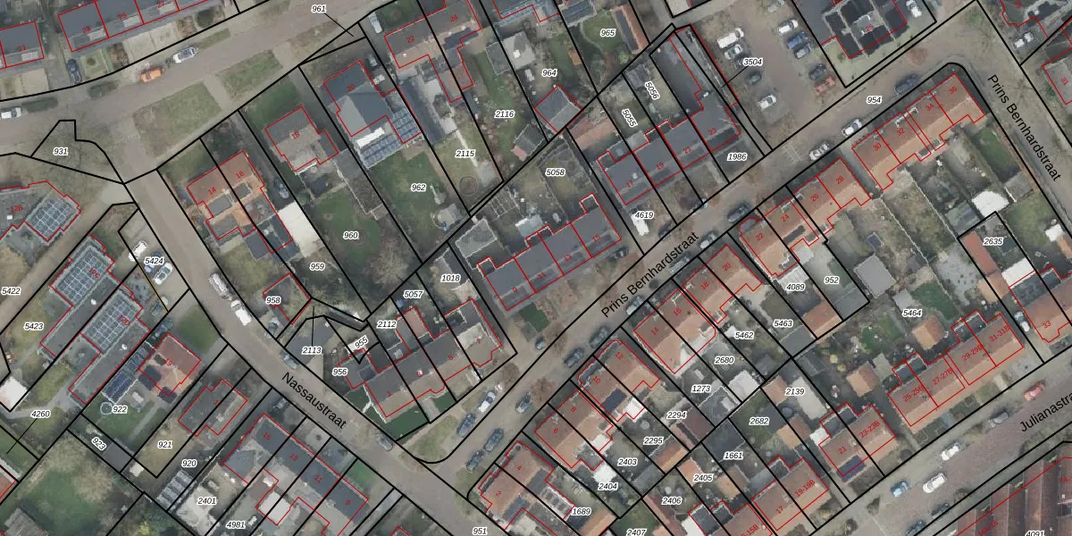 Het perceel waarop Prins Bernhardstraat 11 staat heeft een oppervlakte van 994 m². Dit is een groot perceel. De perceeloppervlakte wordt geregistreerd door het Kadaster. Gedetailleerde informatie over de maten van dit perceel kunt u vinden in het rapport Kadastrale kaart met maatvoering van Prins Bernhardstraat 11.