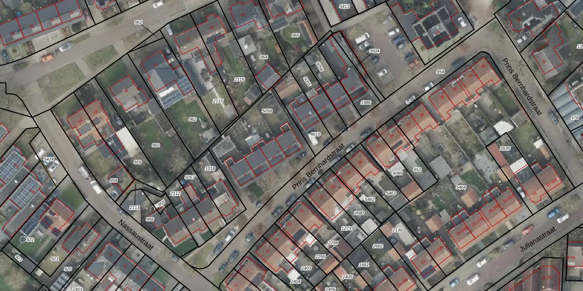 Het perceel waarop Prins Bernhardstraat 15 staat heeft een oppervlakte van 994 m². Dit is een groot perceel. De perceeloppervlakte wordt geregistreerd door het Kadaster. Gedetailleerde informatie over de maten van dit perceel kunt u vinden in het rapport Kadastrale kaart met maatvoering van Prins Bernhardstraat 15.