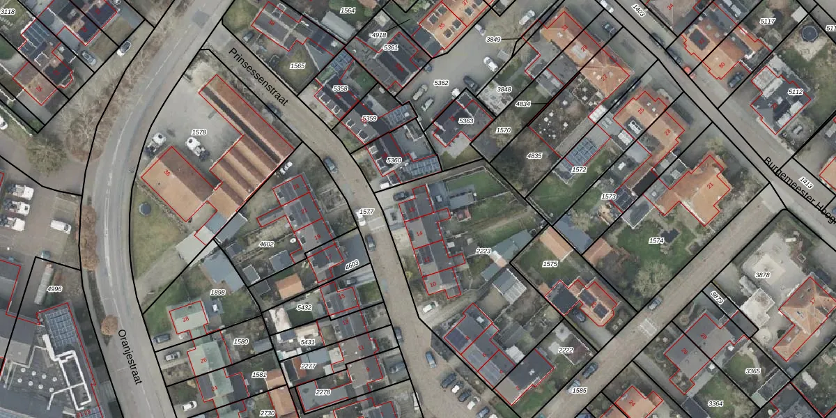 Het perceel waarop Prinsessenstraat 16 staat heeft een oppervlakte van 1403 m². Dit is een zeer groot perceel. De perceeloppervlakte wordt geregistreerd door het Kadaster. Gedetailleerde informatie over de maten van dit perceel kunt u vinden in het rapport Kadastrale kaart met maatvoering van Prinsessenstraat 16.