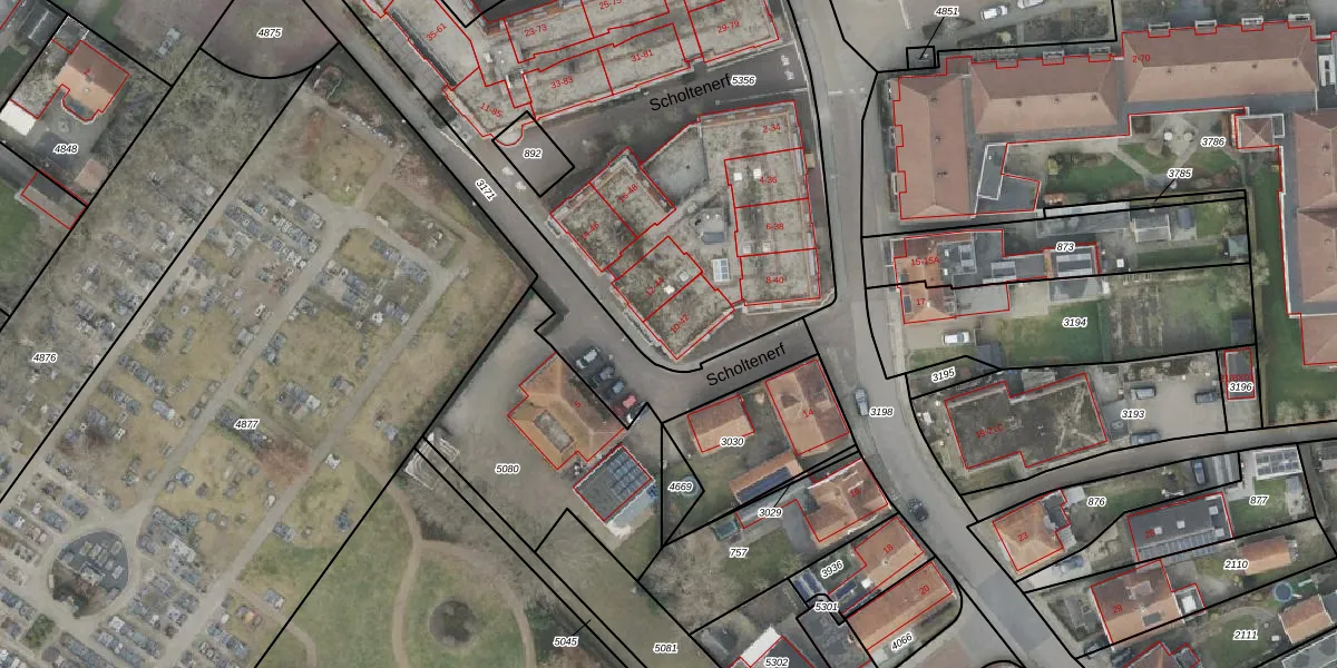 Het perceel waarop Scholtenerf 26 staat heeft een oppervlakte van 2972 m². Dit is een zeer groot perceel. De perceeloppervlakte wordt geregistreerd door het Kadaster. Gedetailleerde informatie over de maten van dit perceel kunt u vinden in het rapport Kadastrale kaart met maatvoering van Scholtenerf 26.