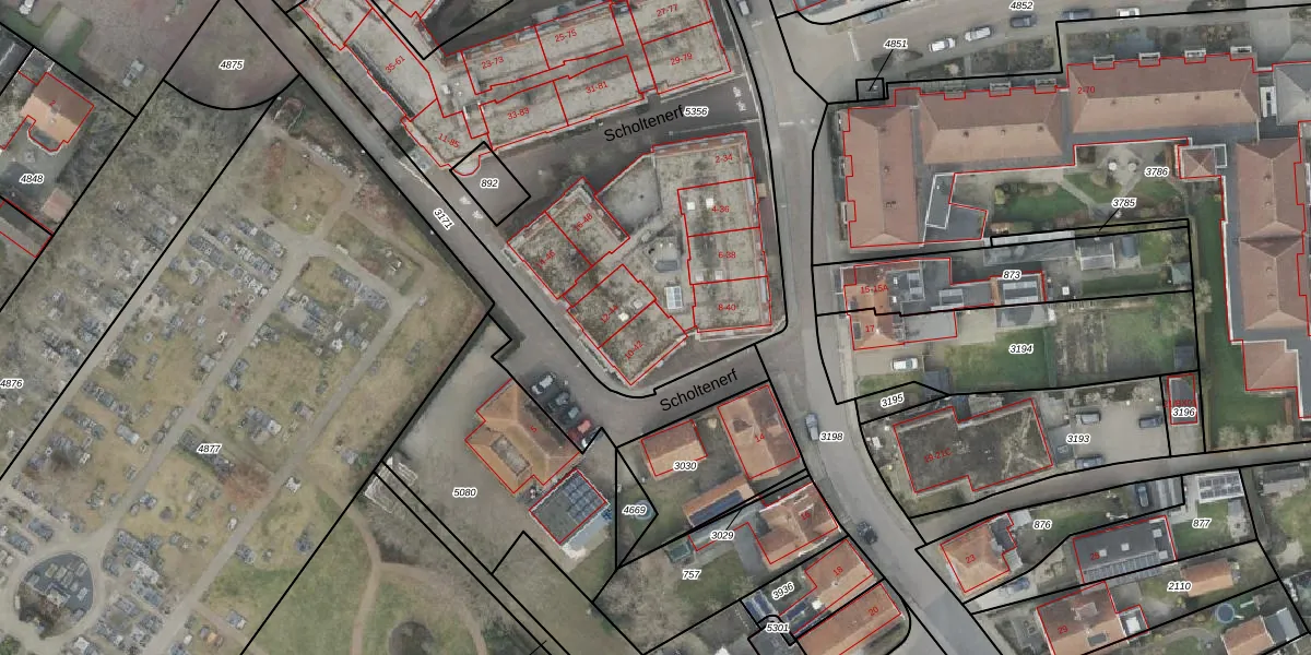 Het perceel waarop Scholtenerf 42 staat heeft een oppervlakte van 2972 m². Dit is een zeer groot perceel. De perceeloppervlakte wordt geregistreerd door het Kadaster. Gedetailleerde informatie over de maten van dit perceel kunt u vinden in het rapport Kadastrale kaart met maatvoering van Scholtenerf 42.